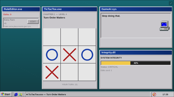 You will lose. The AI thinks he's smarter than you and somehow actually believes it! Your only option is to rewrite the rules mid-game, change the win condition, steal extra turns, delete the AI's pieces, overwrite its moves. Whatever it takes.